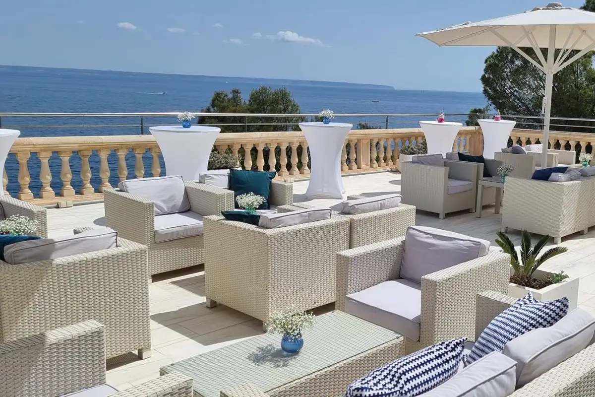 With 180 m² and a private terrace, this is our flagship space for large events. Seating for up to 60 people at tables or 120 in a finger-food format, it offers natural light, flexible layouts and spectacular views of the Mediterranean to elevate any celebration.