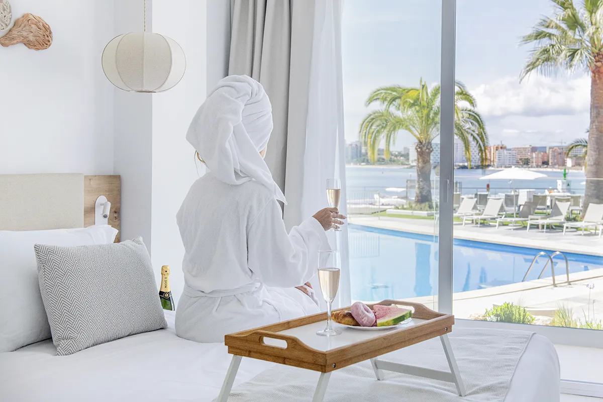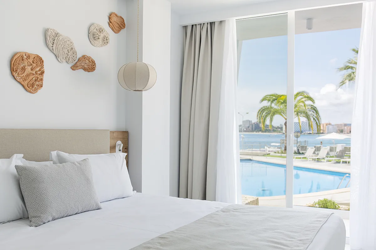 Vive la experiencia de Palmanova desde una suite luminosa y acogedora con vistas laterales al mar. El equilibrio perfecto entre comodidad e intimidad para quienes buscan independencia sin renunciar al encanto mediterráneo.